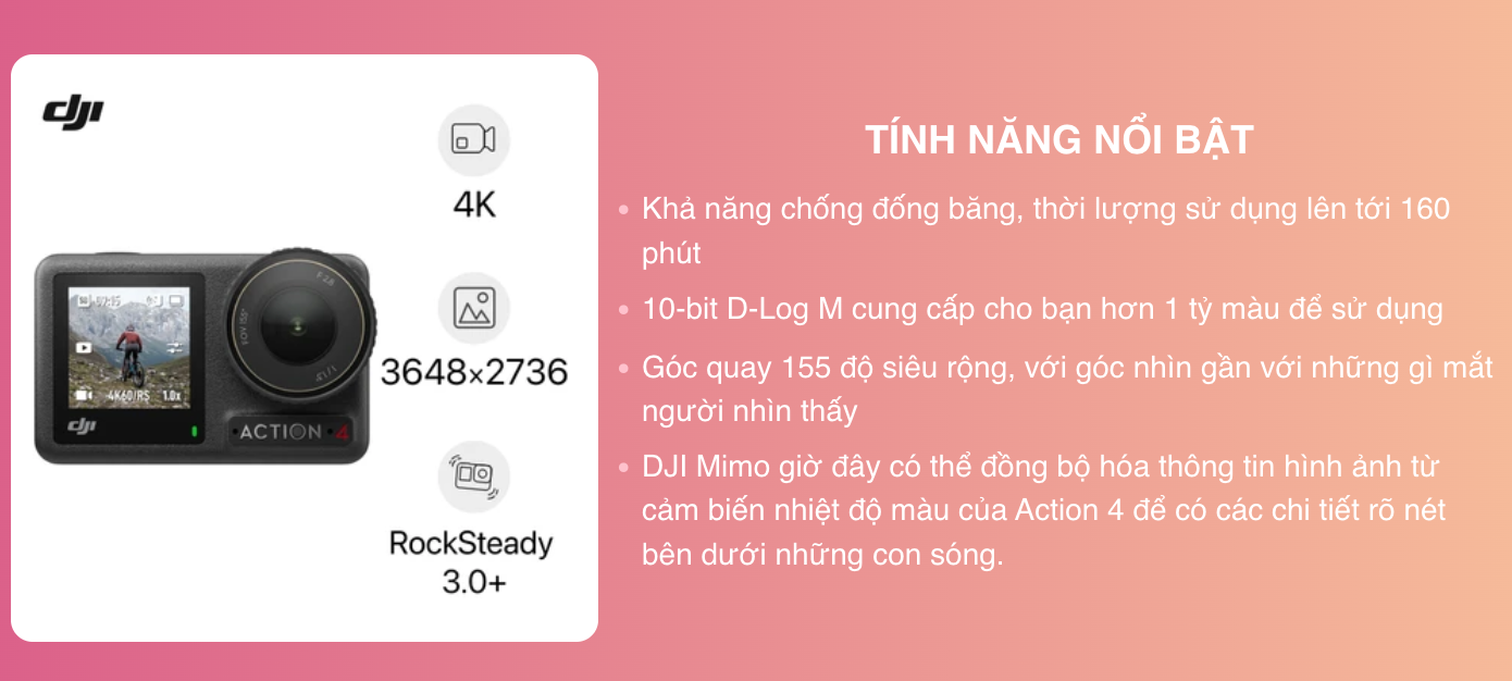 Camera hành động DJI Osmo Action 4 ghi điểm với người dùng khi sở hữu hàng loạt các ưu điểm nổi trội như kiểu dáng gọn nhẹ, linh hoạt, chống nước bền bỉ cùng tính năng ổn định hình ảnh RockSteady 3.0. Nhờ vậy mà mọi trải nghiệm quay phim của người dùng trên thế hệ camera hành trình DJI này đều vô cùng ổn định, mang tới chất lượng hình ảnh sắc nét và cực sống động.