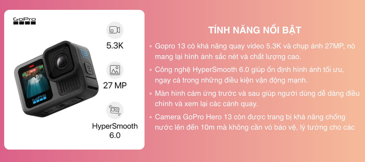 GoPro Hero 13 Black vừa được ra mắt ngày 9/9 được cải tiến về khả năng ghi hình với độ phân giải lên tới 5,3K cùng bộ xử lý GP3 tiên tiến. Đặc biệt, ống kính kỹ thuật số 27 MP trên GoPro 13 còn được tích hợp công nghệ ổn định HyperSmooth 6.0 giúp cải thiện độ ổn định của video. Bên cạnh đó, bạn còn có thể thoải mái ghi hình cả ngày dài với pin Enduro và khả năng chống thấm nước ở độ sâu tối đa lên tới 10m tiện dụng.