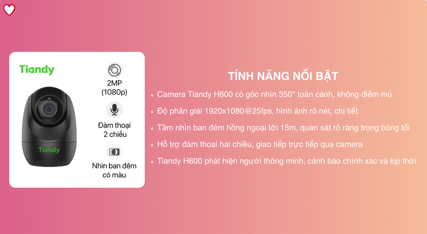 Camera Tiandy H600 là mẫu camera an ninh lý tưởng giúp bảo vệ không gian sống, duy trì an ninh, ngăn chặn kẻ gian xâm nhập với những ưu điểm: