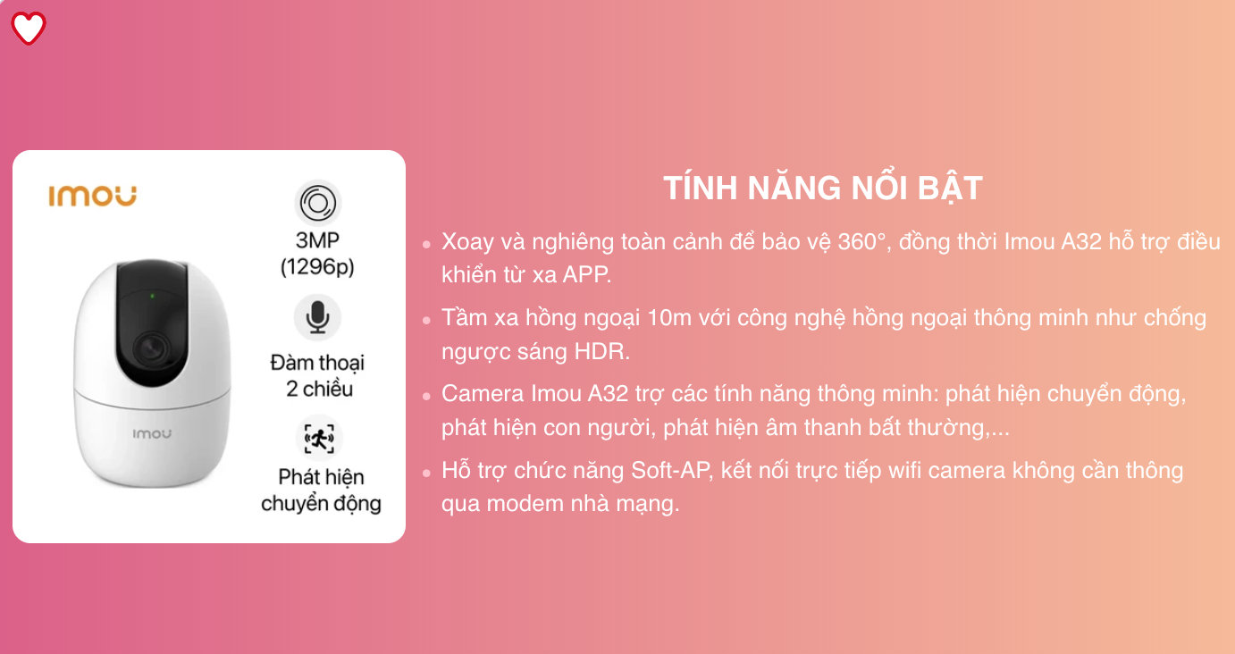 Camera Imou Ranger A32 sở hữu khả năng quay quét 360 độ, hình ảnh sắc nét 3MP, kết nối Wi-Fi ổn định và nhiều tính năng thông minh khác, giúp bạn luôn yên tâm về ngôi nhà của mình. Dù bạn đang ở nhà hay đi làm, chỉ cần một chiếc điện thoại thông minh, bạn có thể dễ dàng theo dõi mọi hoạt động diễn ra xung quanh. Cùng tìm hiểu chi tiết các tính năng của chiếc camera imou A32 thông minh này nhé!
