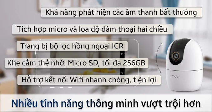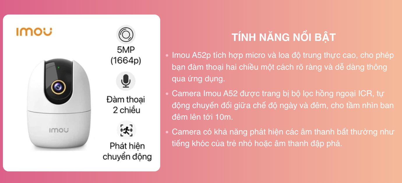 Camera IMOU IPC A52P được tích hợp các tính năng phát hiện thông minh như phát hiện người, tiếng ồn và chuyển động. Khi phát hiện bất kỳ bất thường nào, camera IMOU A52P sẽ gửi cảnh báo ngay tức thì đến điện thoại của người dùng thông qua IMOU Life. Ngoài ra, tính năng theo dõi thông minh giúp camera tự động theo dõi đối tượng di chuyển, mang lại sự yên tâm cho người sử dụng.
