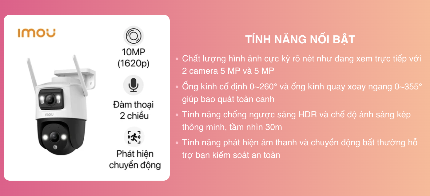 Sản phẩm sở hữu camera cố định góc rộng có khả năng quay tới 355 độ, kết hợp với 2 mắt camera giúp cho phạm vi giám sát rộng hơn đáng kể so với thế hệ trước. Đặc biệt, độ nét khi xem trực tiếp từ thiết bị này là 5MP + 5MP lần lượt ống kính 3.6mm và 2.8mm.