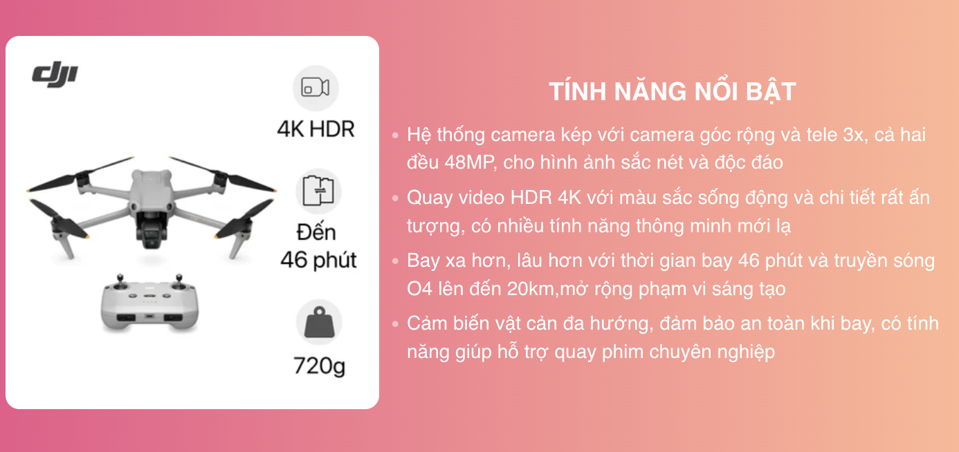 DJI Air 3 sở hữu camera kép có độ phân giải 48MP, thời gian bay lên đến 46 phút, cảm biến vật cản đa hướng, truyền sóng DJI O4 và quay video HDR 4K/60fps.