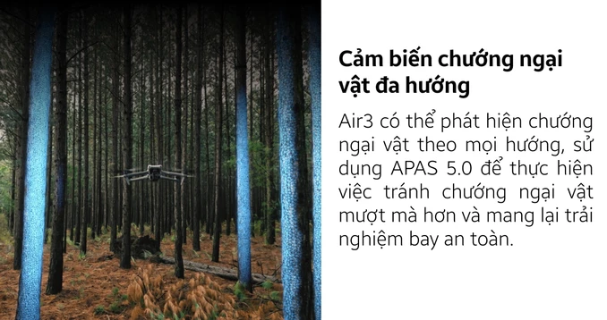 DJI Air 3 Combo mang đến một bước đột phá trong công nghệ flycam với việc trang bị cảm biến vật cản đa hướng siêu nhạy, đảm bảo an toàn tuyệt đối cho mỗi chuyến bay. Cụ thể, hệ thống cảm biến này bao phủ toàn thân DJI Air 3, nhờ đó mà drone có khả năng nhận diện mọi vật xung quanh, giúp máy bay tránh chướng ngại vật một cách chính xác và linh hoạt.