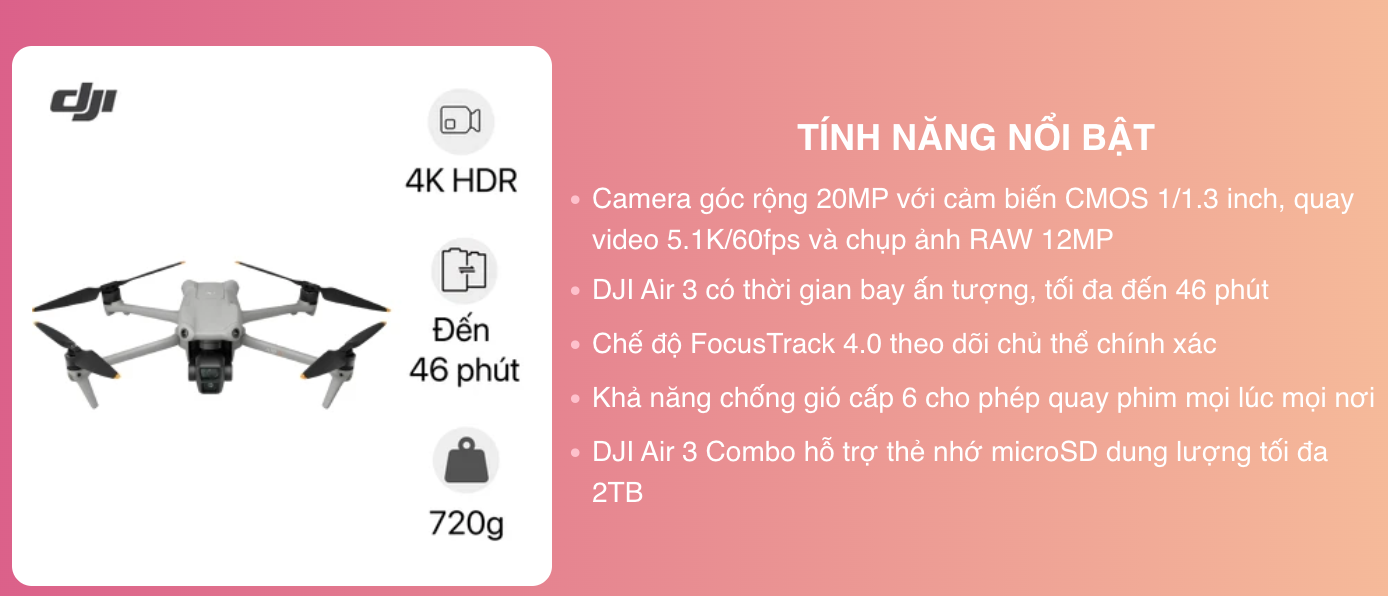 DJI Air 3 fly more combo là sự kết hợp hoàn hảo giữa công nghệ tiên tiến và tính năng đa dạng, mang đến cho người dùng trải nghiệm bay từ trên cao không thể bỏ qua. Dưới đây là một số tính năng gây ấn tượng mạnh của DJI Air 3 combo: