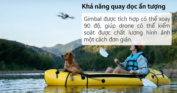 Giống như người anh em DJI Mini 3 Pro ở phiên bản cao cấp, DJI Mini 3 cũng được trang bị tính năng quay video dọc độc đáo. Tính năng này cho phép người dùng linh hoạt chuyển đổi giữa chế độ quay phong cảnh và chân dung. Drone được trang bị gimbal có thể giúp Flycam xoay 90 độ, giúp đảm bảo chất lượng hình ảnh một cách đơn giản.