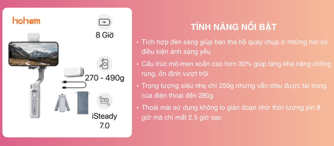 Tay cầm chống rung Hohem Xe Kit được trang bị thuật toán iSteady 7.0 được nâng cấp nhờ đó giúp mang lại trải nghiệm chụp ảnh và quay phim ấn tượng trên điện thoại. Với động cơ mạnh mẽ cùng công nghệ giúp cải thiện tới 30% khả năng chống rung so với trên thế hệ trước.