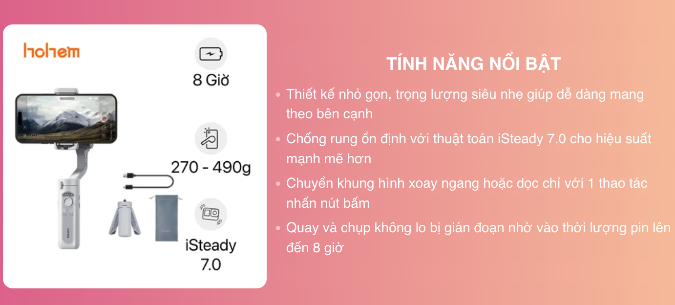 Tay cầm chống rung Hohem XE đột phá trong việc cung cấp khả năng chống rung vượt trội cho quá trình quay video và chụp ảnh. Với công nghệ chống rung 3 trục iSteady 7.0, thiết bị trở thành trợ thủ đắc lực cho người dùng muốn tạo ra những tác phẩm nghệ thuật chất lượng cao.