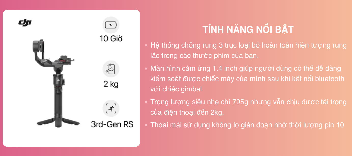 Tay cầm chống rung máy ảnh DJI Ronin RS3 Mini là một sự kết hợp hoàn hảo giữa thiết kế nhỏ gọn và hiệu năng mạnh mẽ. Với những tính năng tiên tiến và khả năng ứng dụng đa dạng, Ronin RS3 Mini là lựa chọn lý tưởng cho bất kỳ ai đang tìm kiếm sự ổn định và chất lượng trong từng khung hình.